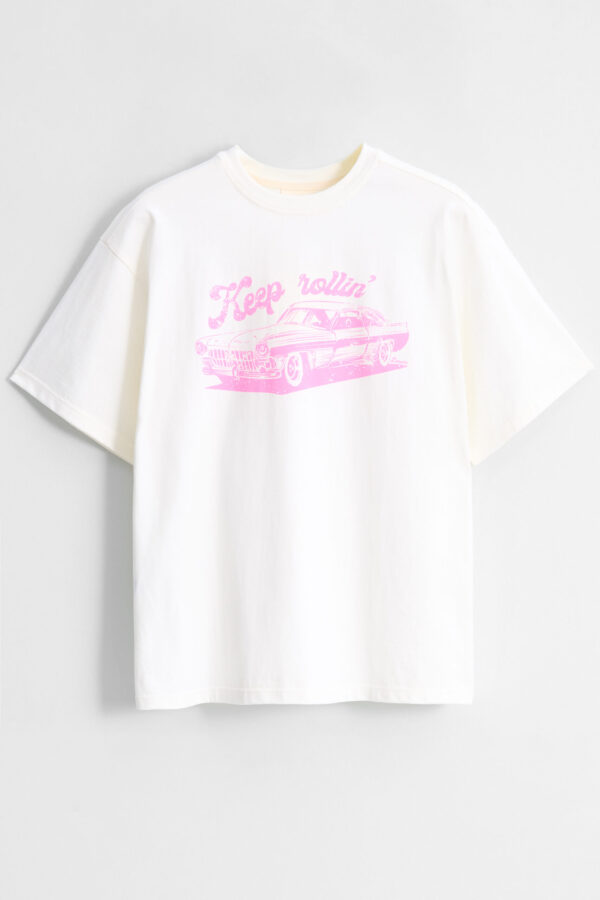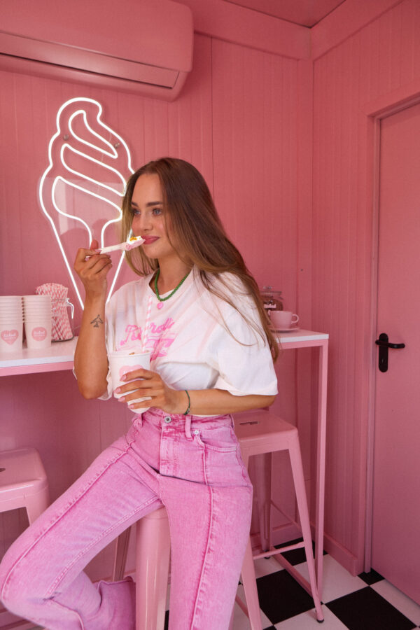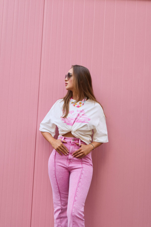 T-shirt w kolorze złamanej bieli o oversizeowym kroju. Miękka, oddychająca bawełna i luźny fason sprawiają, że to koszulka, po którą sięgasz bez zastanowienia. Idealna dla fanów vintage vibe’u, slow fashion i detali, które robią różnicę. „Pink Ride” to t-shirt z grafiką różowego samochodu w stylu retro – hołd dla klasycznych lat 60., wolności i luzu na pełnym gazie. Nadruk został wykonany metodą sitodruku farbą wodną, co nie tylko daje piękny, matowy efekt, ale przede wszystkim jest przyjazne dla środowiska.