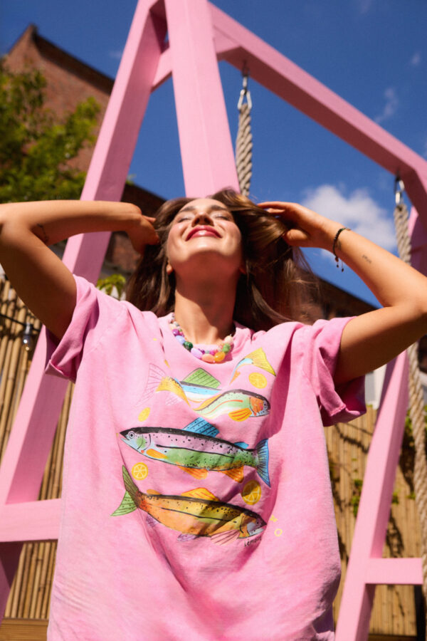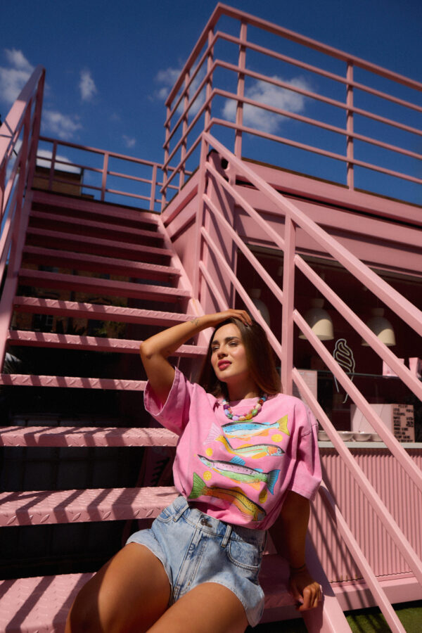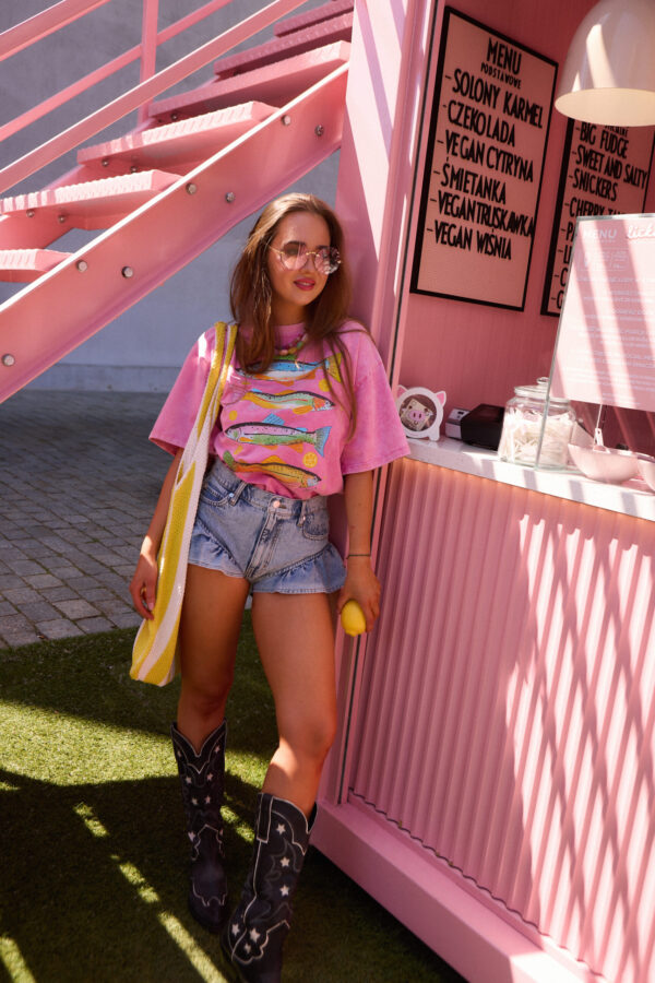 wyjątkowym. Na froncie metodą druku termotransferowego – dzięki czemu grafika jest niezwykle trwała – naniesiono zabawny rysunek sardynek. Jest to wyrazisty akcent, który ożywi każdą stylizację. To doskonała baza do miejskich, codziennych looków.