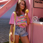 Przełam oversize’owy krój, tworząc supeł – to świetny trik, który podkreśli talię i sprawi, że t-shirt nabierze bardziej kobiecego, zadziornego charakteru. Idealny do spódnic z wysokim stanem czy szortów.
