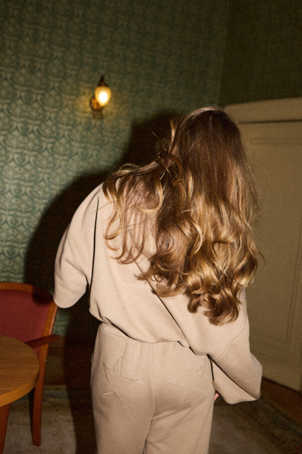 Szerokie spodnie Bae wyróżnia wysoki stan i luźna, swobodnie opadająca nogawka. Doskonale wydłużają sylwetkę i podkreślają talię, jednocześnie dając pełną swobodę ruchu. Spodnie posiadają odcinany pasek z subtelnymi przeszyciami oraz regulowany sznurek umieszczony wewnątrz, który pozwala na idealnie dopasowanie spodni do obwodu talii. Boczne, skośne kieszenie dodają funkcjonalności. Z tyłu znajdują się dwa hafty w kształcie gwiazdek dopasowane do koloru dzianiny – to subtelny, ale charakterystyczny detal, który dodaje spodniom oryginalności. W jednej z gwiazdek ukryta jest nazwa marki.