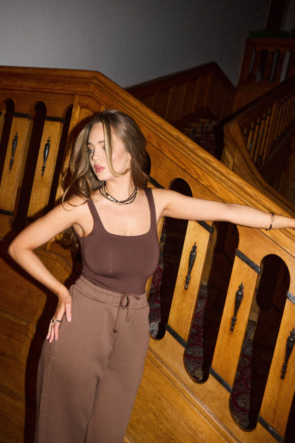 Spodnie Hugger wyróżnia wysoki stan oraz lekko zwężająca się nogawka zakończona gumką. W pasie znajduje się odcinany pasek z subtelnymi przeszyciami oraz regulowany sznurek umieszczony wewnątrz, który pozwala na idealne dopasowanie spodni do wymiarów talii. Praktyczne kieszenie w szwach bocznych gwarantują funkcjonalność i minimalistyczny wygląd. Z tyłu znajdują się dwa hafty w kształcie gwiazdek dopasowane do koloru dzianiny – to subtelny, ale charakterystyczny detal, który dodaje spodniom oryginalności. W jednej z gwiazdek ukryta jest nazwa marki.